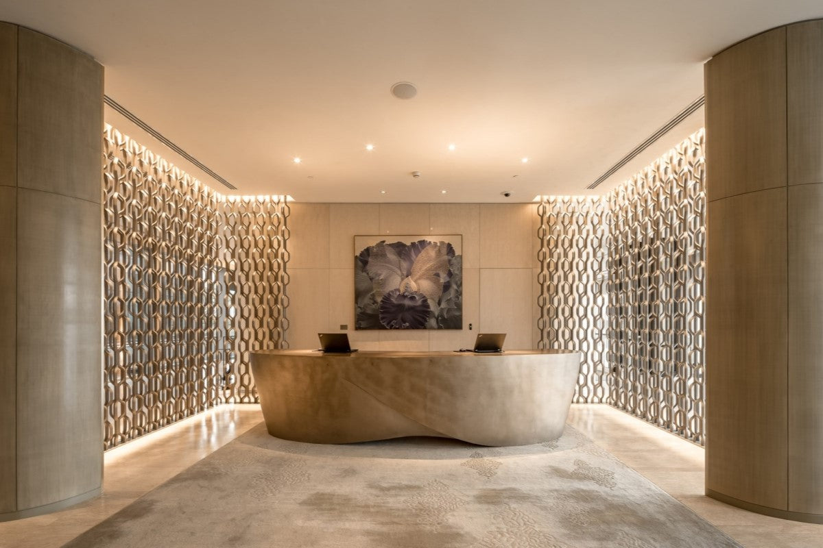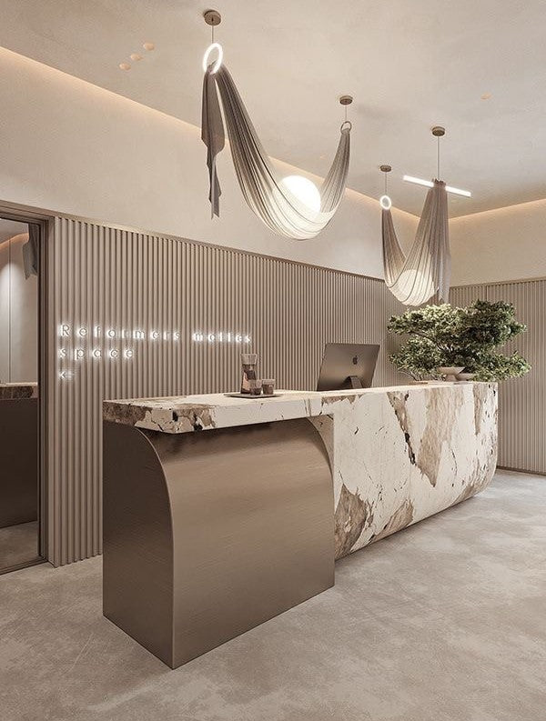 Empfangstresen aus Marmor oder Corian-Stein sehen luxuriös und sehr langlebig aus und ihre glatte Oberfläche macht sie leicht sauber und pflegeleicht. Sie lassen sich außerdem leicht formen, was sie zur idealen Wahl für individuelle Anforderungen an Empfangstresen macht. Corian ist bei Erwärmung flexibel und kann in viele Formen gebracht oder wie Holz bearbeitet werden, um perfekt abgerundete Kanten zu erhalten. Dies gibt Designern die Freiheit, innovative Lösungen für nahezu jedes Design-Szenario zu schaffen.